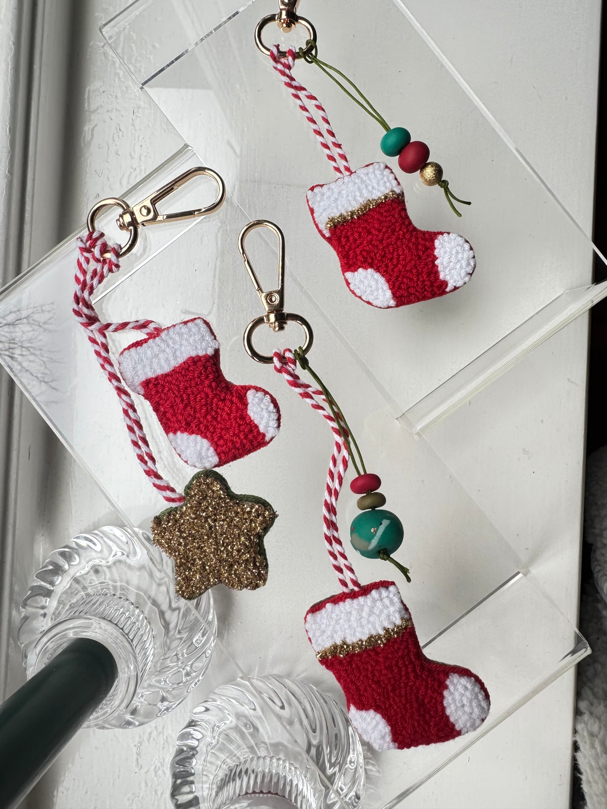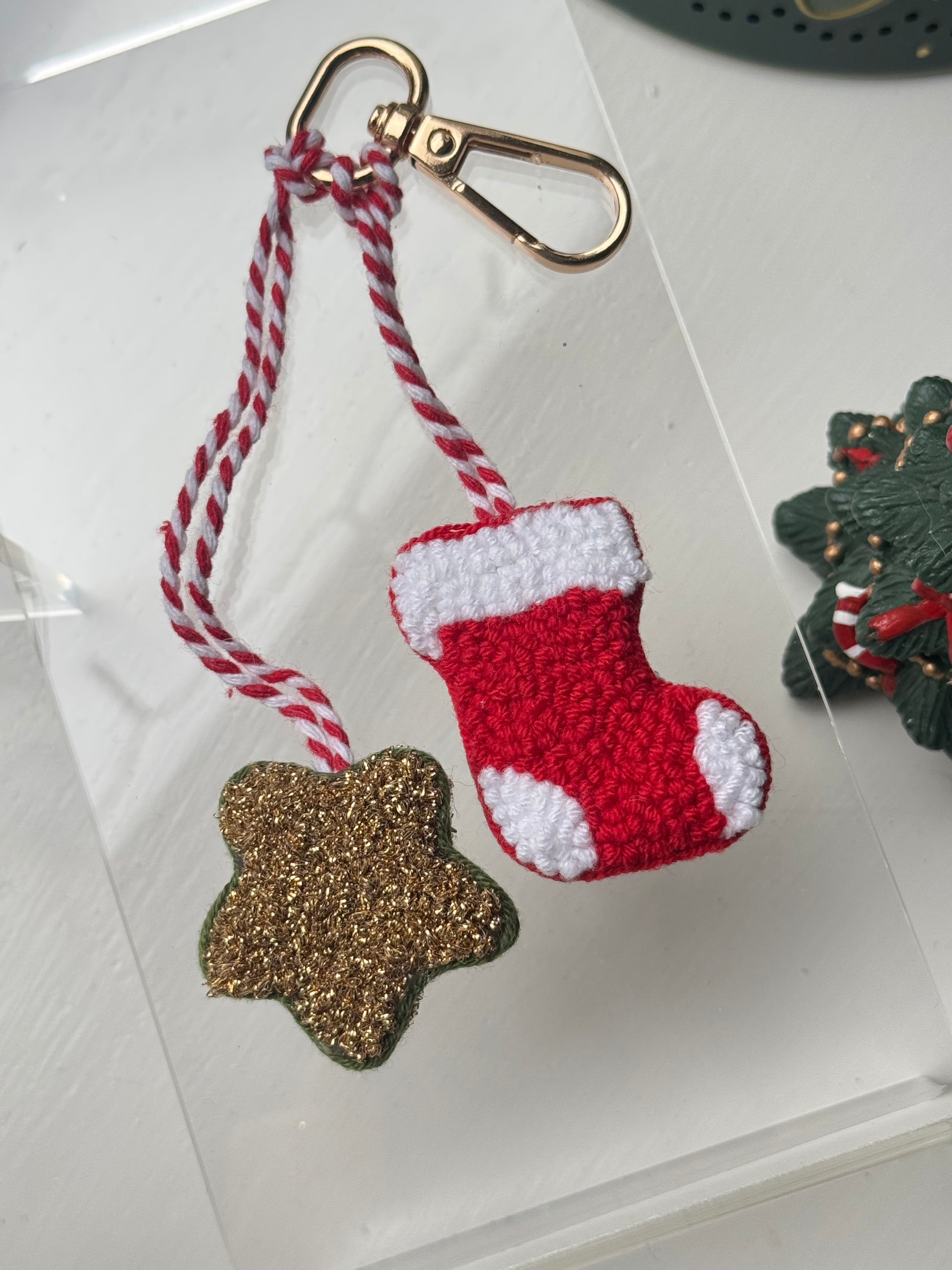 Handmade Christmas Stocking & Gold Star Punch Needle Keychain – Festive, Sparkly & One-of-a-Kind