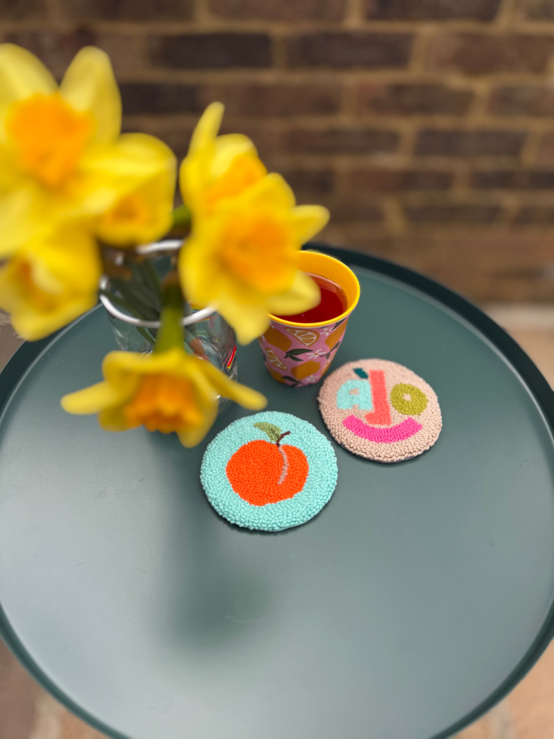 Crafted with 100% cotton yarn using the punch needle technique, it’s soft, durable, and full of character. Whether you're sipping coffee or sharing laughs with friends, this cheerful design is here to brighten your day—one cup at a time.