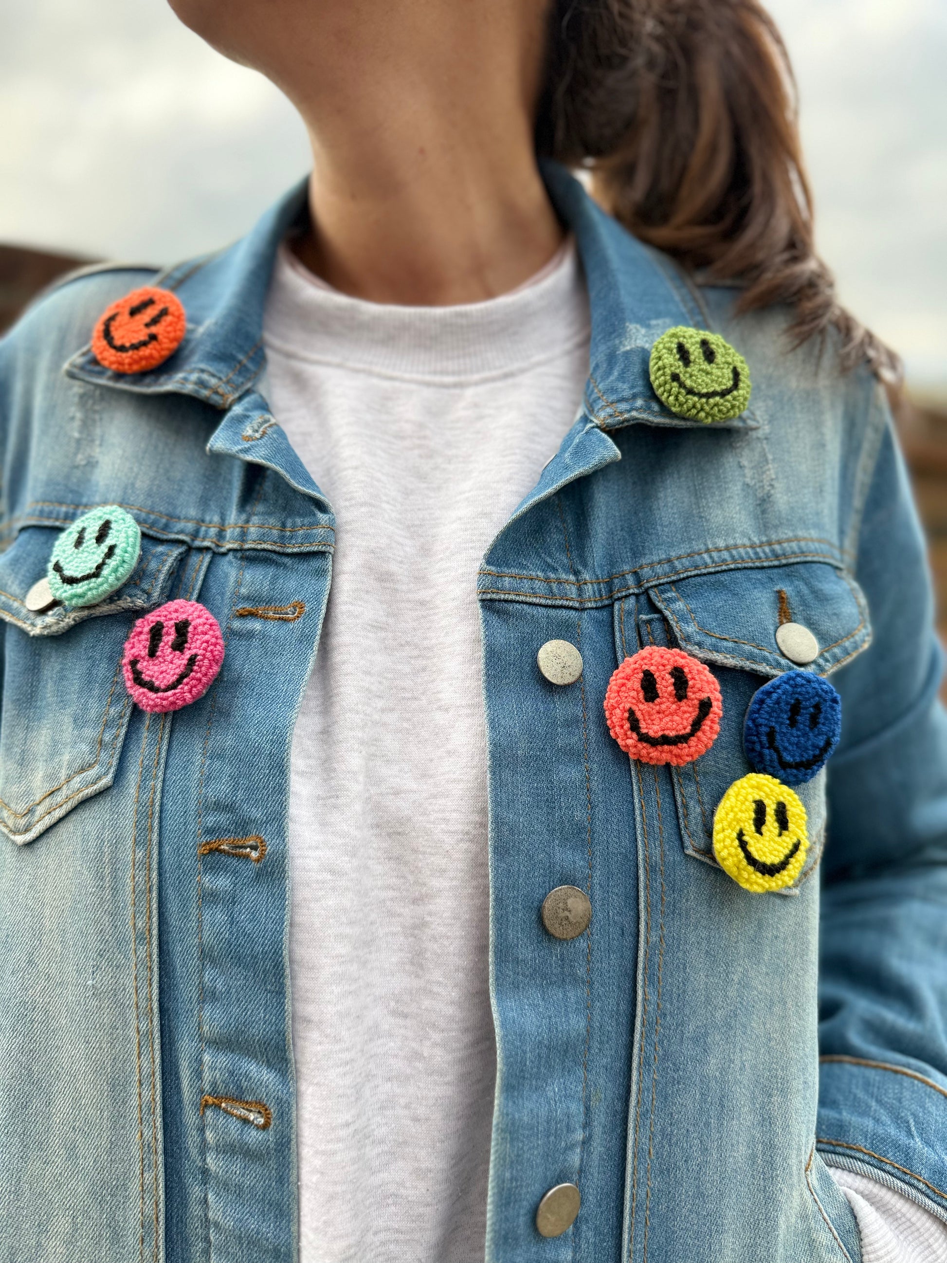 Each smiley is lovingly crafted using the punch needle technique, making every piece unique and full of personality. Whether you're decorating your bag, denim jacket, or gifting a friend, this pin is sure to spread good vibes.